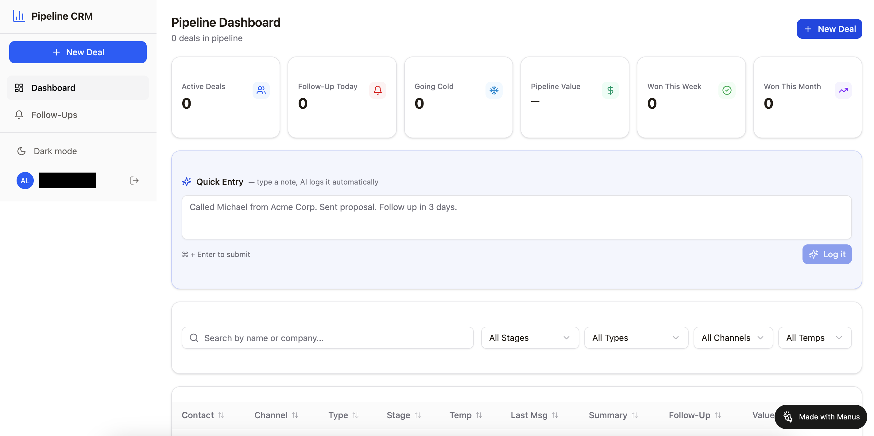 And if you want to add something later — a deal value column, an email reminder for overdue follow-ups, a notes export — you just tell Manus what you need and it updates the app. It grows with you.